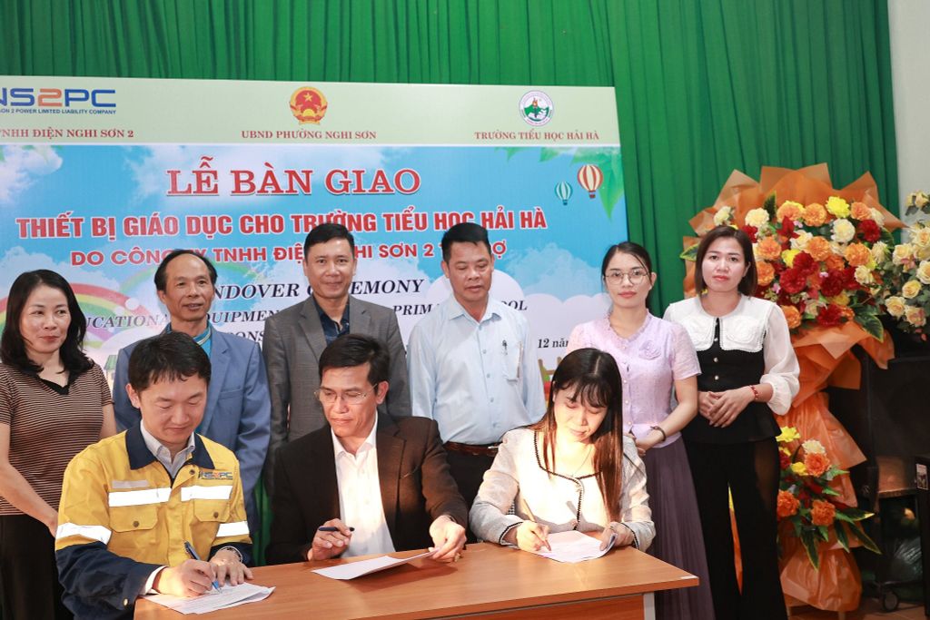 Mr. Watanabe Yasuaki (on the left) signs handover minute with Mr. Nguyen Van Hoan, Deputy Chairman of Nghi Son Ward People's Committee and Principle of Hai Ha primary school