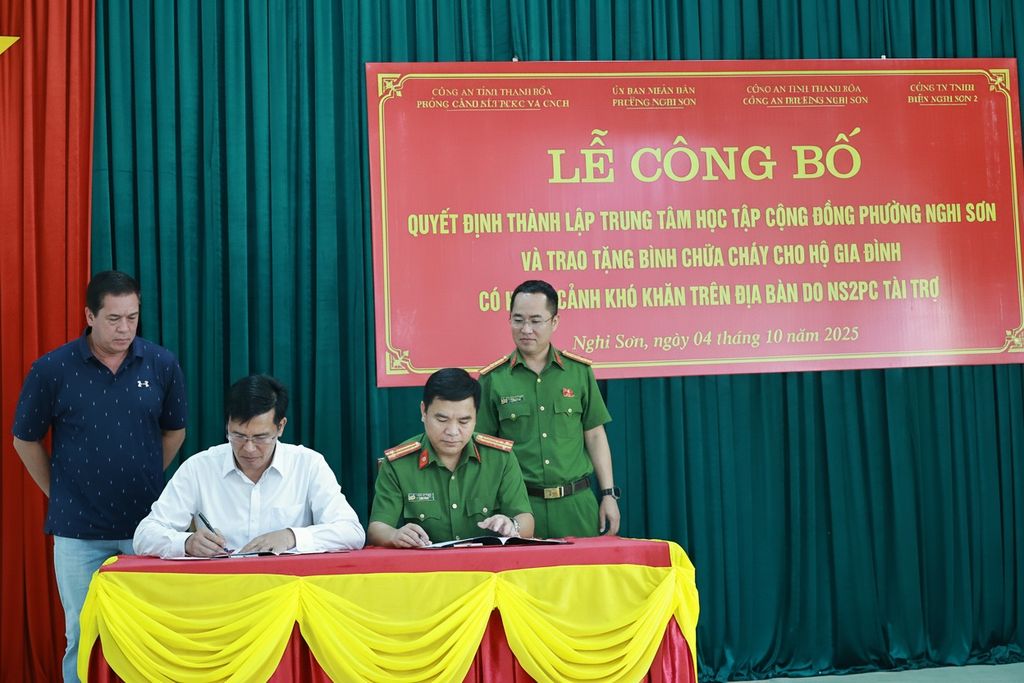 Ngày 4/10/2025, tại phường Nghi Sơn, UBND phường tổ chức Lễ công bố và ra mắt Trung tâm Học tập cộng đồng (TTHTCĐ) về Phòng cháy chữa cháy và Cứu nạn, cứu hộ (PCCC & CNCH), đồng thời trao tặng 420 bình chữa cháy cho các hộ dân, do Công ty TNHH Điện Nghi Sơn 2 (NS2PC) tài trợ. Đây là mô hình “gắn kết cộng đồng”, cụ thể hóa chủ trương của UBND tỉnh Thanh Hóa về lồng ghép nội dung PCCC & CNCH trong hoạt động học tập cộng đồng, góp phần nâng cao kiến thức, kỹ năng phòng chống cháy nổ trong nhân dân.